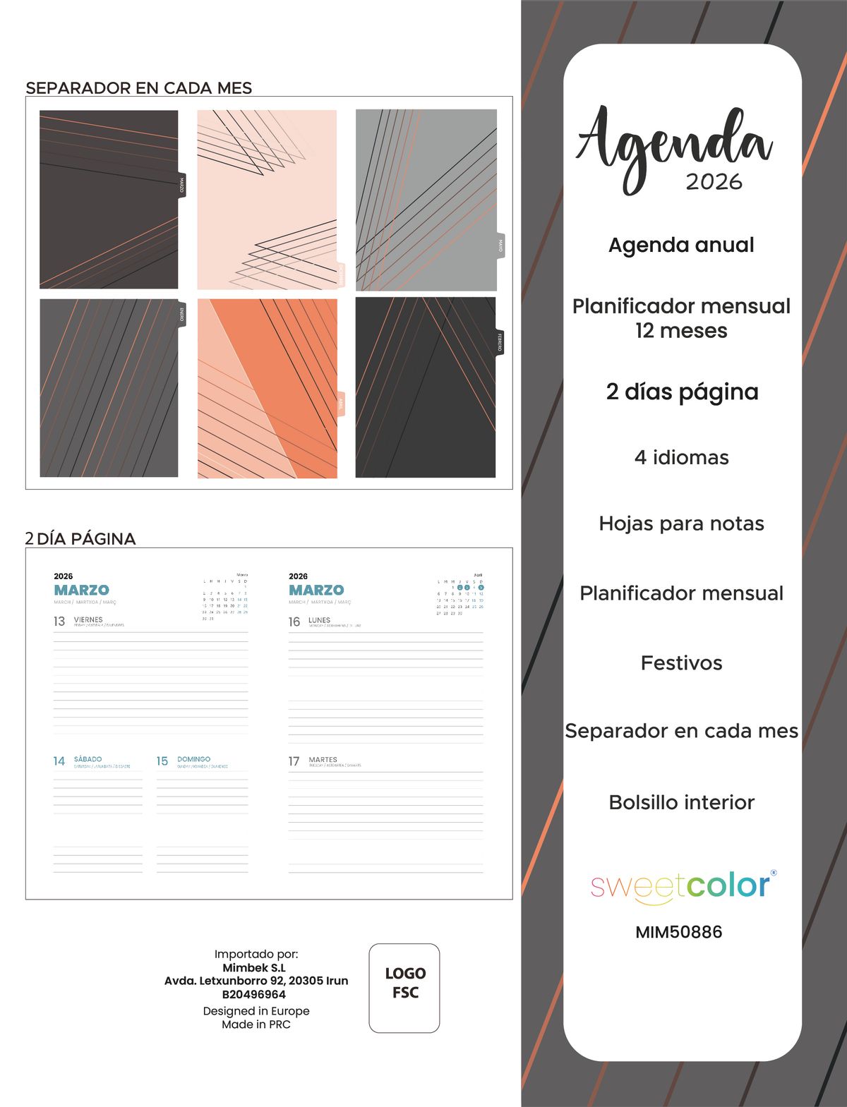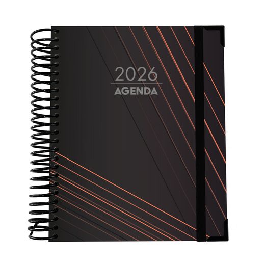 Agenda anual 2026. 12 meses; de enero a diciembre.•2 días página.•Hojas para notas.•Planificadores mensuales.•Calendario Anual 2026/2027.•Fechas importantes.•Webs de interés.•Contactos importantes.•Planificador anual.•Horarios.•Planes del mes.•Separadores mensuales originales.•Apartado de notas y recordatorios.• Bolsillo interior.• 4 Idiomas: Castellano, Inglés, Euskera y Catalán.•Hojas de 80 gr. Certificado FSC.•Goma de cierre. Encuadernación en espiral plástico.•Portadas forradas, encuadernadas con esquineras metálicas de refuerzo. •Dimensiones: 17,5 x 21,5 cm.