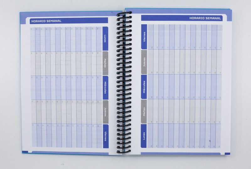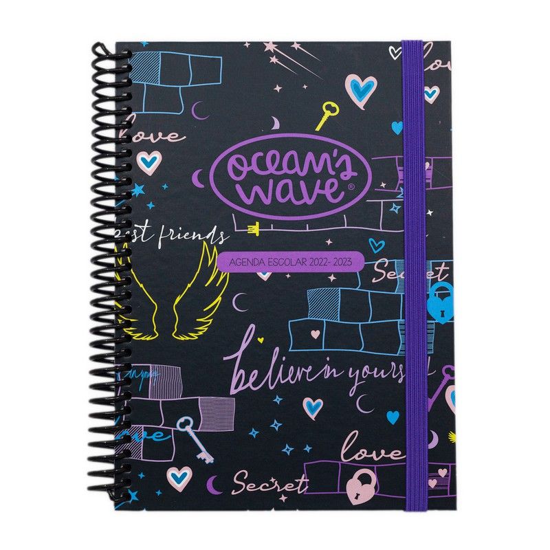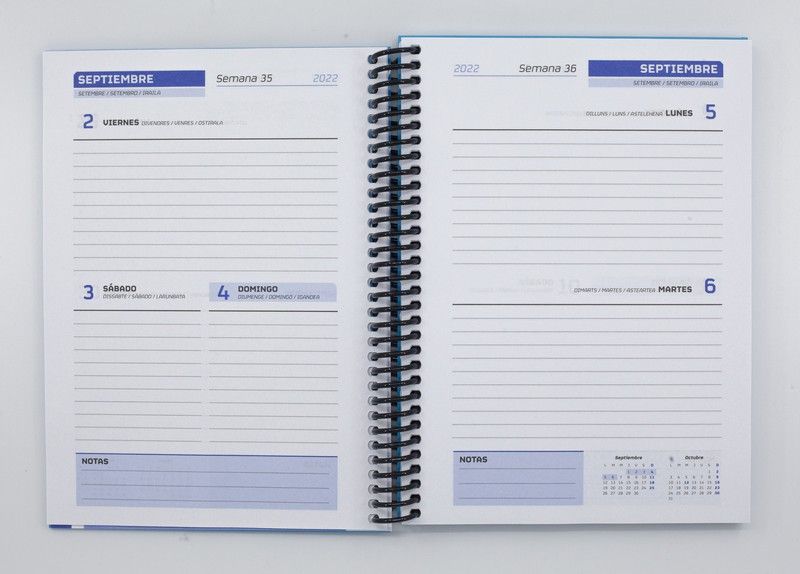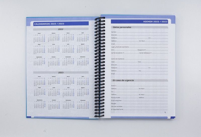 Agenda Escolar 2022-23 dia página. 130pág.Papel 80 gr con encuadernación de carton forrado y espiral de plástico negro.
