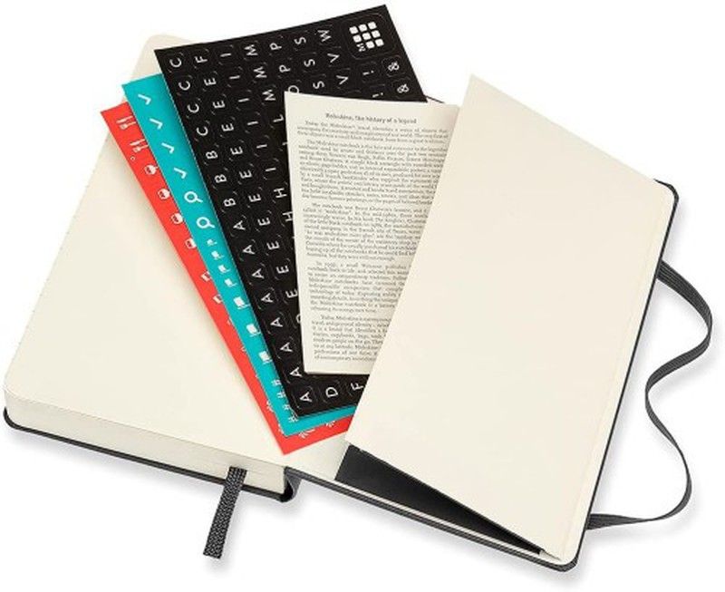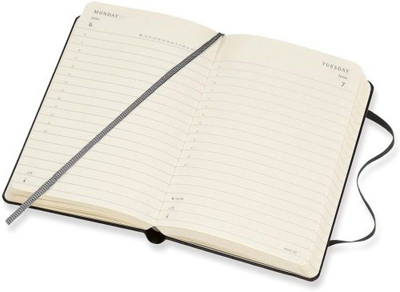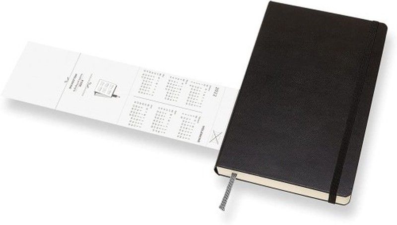 La prestigiosa marca moleskine presenta aquí las clásicas agendas en dos colores lisos ( negro y rojo) en tapa dura y con interior semana vista. Puede elegir dos tamaños, pocket de 9 x 14 cm y el large de 13 x 21 cm.. Como en sus cuadernos estas agendas también tiene su característico cierre elástico y un marcador del mismo color que las tapas. El papel interior es de 70gr en color crema.. En el exterior tiene una guarda delantera con aviso "en caso de pérdida". En el interior tiene un bolsillo expandible en cartón y tela con encartes de colores adhesivos con iconos.