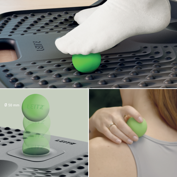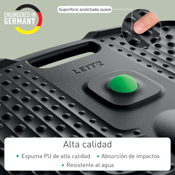 Más informaciónMantente activo y SIÉNTETE BIEN con la alfombrilla antifatiga Leitz Ergo Active de alta calidad, diseñada cuidadosamente para promover el movimiento natural y ofrecer una comodidad duradera para cualquier persona que pase largas horas de pie en el trabajo, ya sea en una oficina, en casa o en otros entornos. Estar mucho tiempo de pie sobre superficies duras puede provocar molestias y tensiones en los pies, las piernas y la zona lumbar, por lo que un apoyo adecuado es esencial para mantener un espacio de trabajo saludable y productivo. Esta alfombrilla antifatiga de diseño ergonómico cuenta con múltiples zonas de masaje que pueden ayudar a prevenir y aliviar el estrés, aliviar la tensión muscular, favorecer la circulación sanguínea y apoyar los estiramientos. Su borde elevado fomenta de forma natural el movimiento de los pies, manteniendo el cuerpo activo y ocupado durante todo el día, mientras que los nódulos de masaje elevados proporcionan un alivio calmante para los pies descalzos, también con calcetines. Resistente y duradera, esta alfombrilla de pie premium cuenta con un acolchado de espuma suave de alta calidad que puede ayudar a mejorar la fatiga de los pies y favorecer una buena postura. La exclusiva bola de masaje extraíble ofrece un alivio más profundo y específico para los pies, pero también puede utilizarse para las muñecas y los hombros cansados, lo que la convierte en una herramienta versátil para mejorar tu bienestar físico. El diseño compacto de esta alfombrilla de pie permite guardarla fácilmente, con un asa incorporada para transportarla o colgarla cómodamente. Su estilo moderno y minimalista lo convierte en un complemento perfecto para tu hogar, oficina o lugar de trabajo, ya que mejora la comodidad y aumenta la productividad. Nuestra misión es ofrecer soluciones que permitan a las personas prosperar en el trabajo y fuera de él, promoviendo una salud mental y un bienestar físico positivos. Combínalo con otros productos Leitz Ergo para personalizar tu estación de trabajo flexible e individual sit, stand & move. Mantente activo, siéntete inspirado y disfruta de la comodidad en el trabajo y fuera de él: donde el diseño centrado en el ser humano se une a la máxima calidad. FEEL GOOD con Leitz.