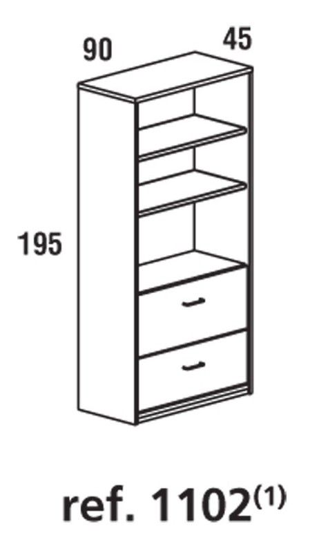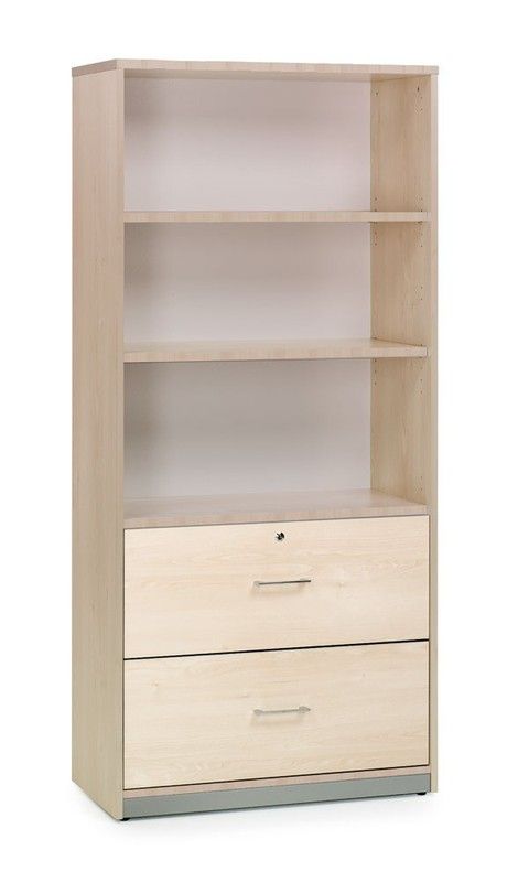 Armario de oficina abierto y con dos cajones carpeteros. Tamaño 195x90x45 cm. Las baldas están incluidas y disponen de un zócalo metálico. Elige el color que quieras. Nuestros armarios de oficina tienen estructura de melamina de 19 y 25mm de grosor con canto de pvc. La mecanización total del armario consigue la fijación de múltiples combinaciones. La trasera de los armarios está hecha dm de 3mm pintada por las dos caras en color gris. Posibilidad de hasta ocho combinaciones de color en cada una de la estructuras elegidas. Gran variedad de medidas y distribuciones.