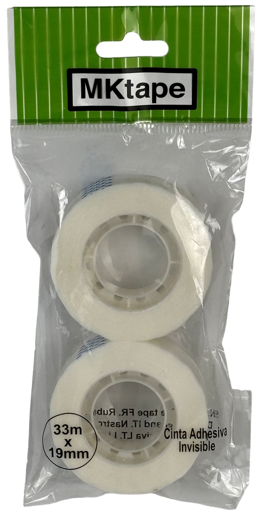 Blíster de 2 rollos de cinta adhesiva invisible. Tamaño: 33m x 19 mm.