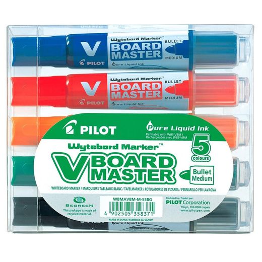 Estuche con 5 unidades surtidas de Rotulador Pizarra Vboard Master. Contiene 5 unidades en colores: negro, azul, rojo, verde y naranja.