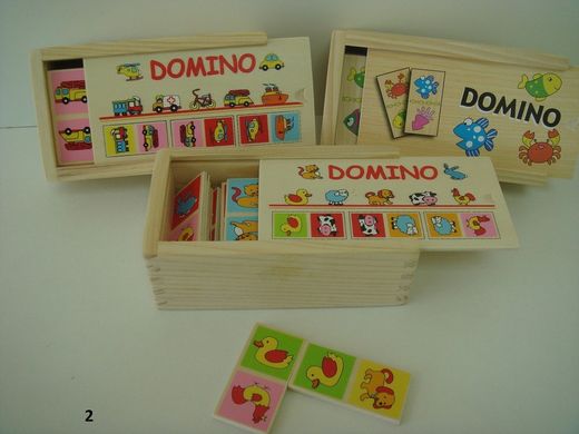 Juego dominó de madera con dibujos de motivos infantiles. Adecuado para niños para activar la capacidad de asociación de imágenes y conceptos.