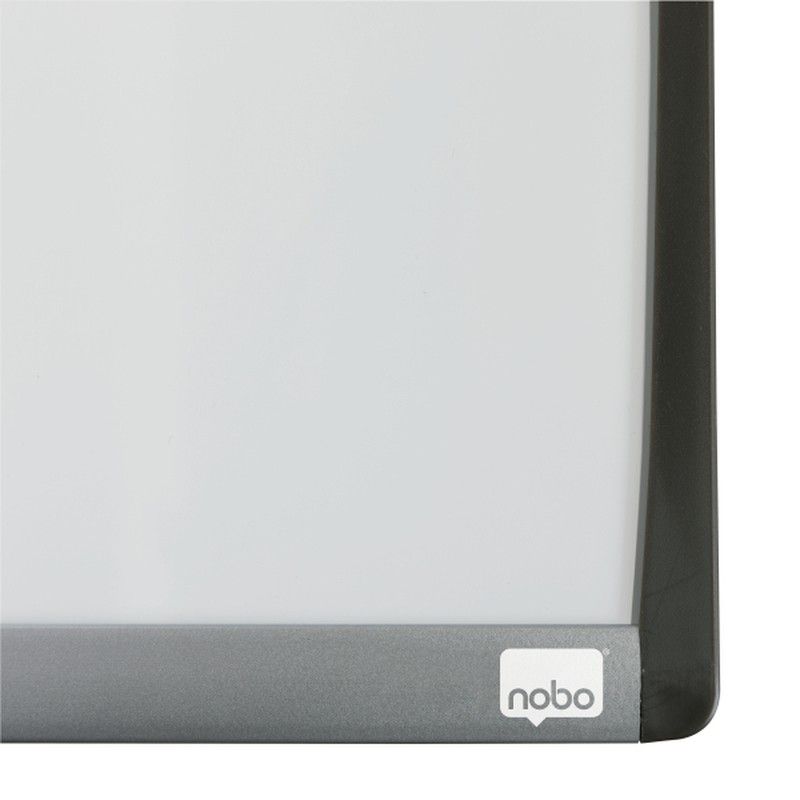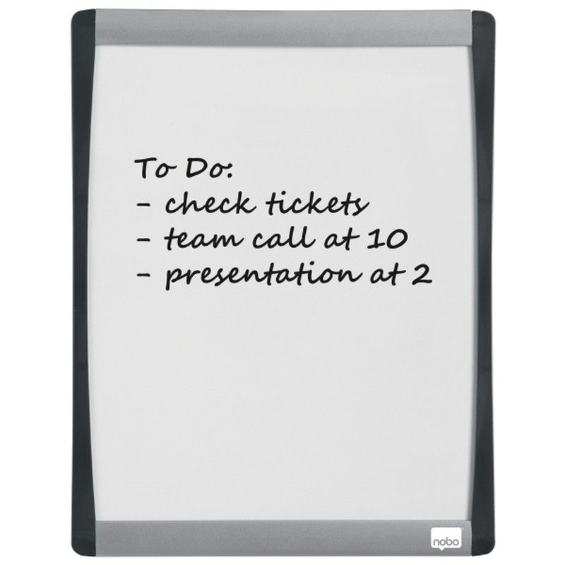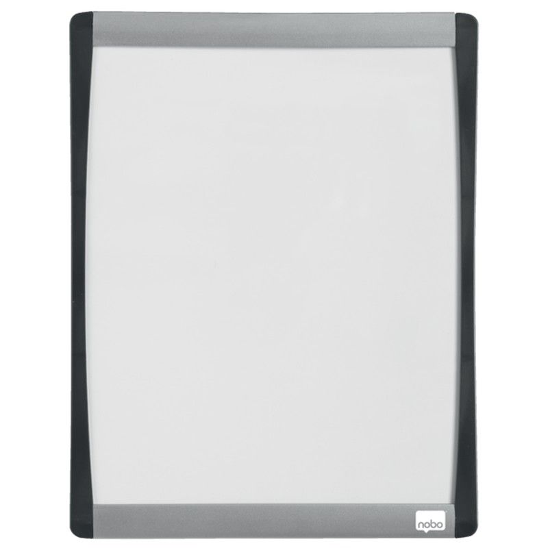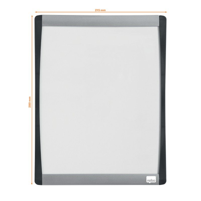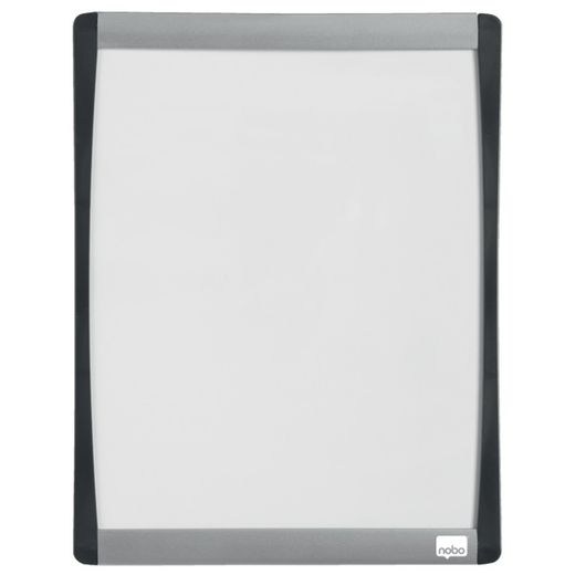Mini pizarra magnética con un elegante marco arqueado plateado y negro. Tamaño 215x280 mm.