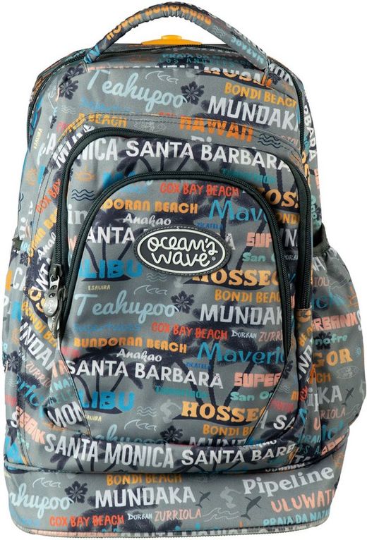Mochila de carro robusto con resistentes ruedas de 8,5cm y mango extensible con 3 posiciones para adecuarla a la altura del joven. Tiene una gran capacidad de 35 litros divididos en 3 bolsillos de cremallera y 2 bolsillos laterales para botellas o estuches. Además del mango extensible lleva tirantes acolchados y asa por si no se quiere arrastrar. Fabricado con tejido resistente al agua. Tanto los tirantes acolchados como las 3 posiciones del mango son imprescindibles para una buena postura del chico o la chica y así evitar futuros dolores por malas posiciones. Tiene unas medidas de 35cm de ancho x 50 cm de alto. La pequeña ciudad del sur de California da nombre a esta gran mochila