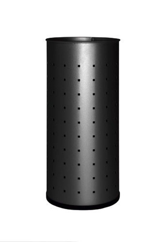 Paragüero metálico perforado en color negro con aro inferior de pvc para prevenir la oxidación. Capacidad: 21,5 litros. Dimensiones: 21,5 cm de diámetro y 50 cm de altura.