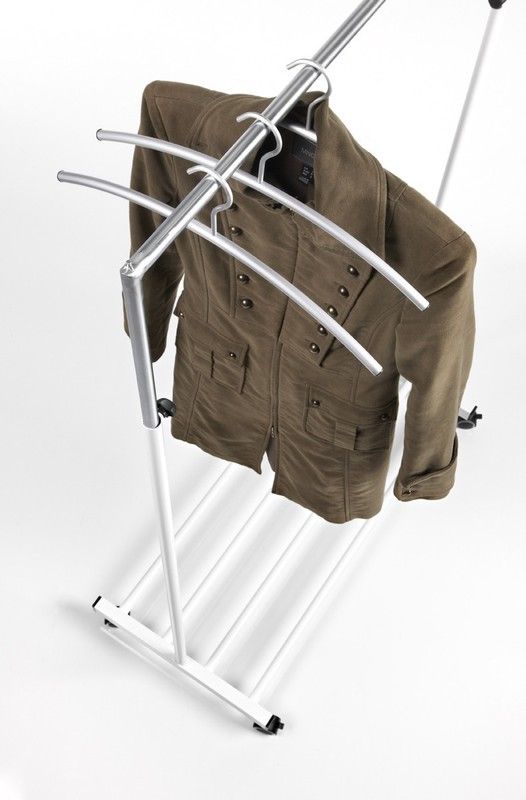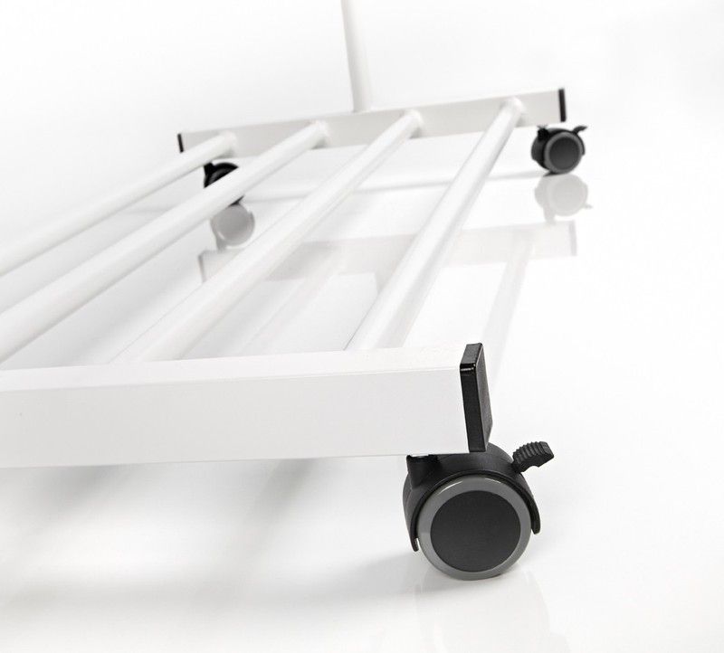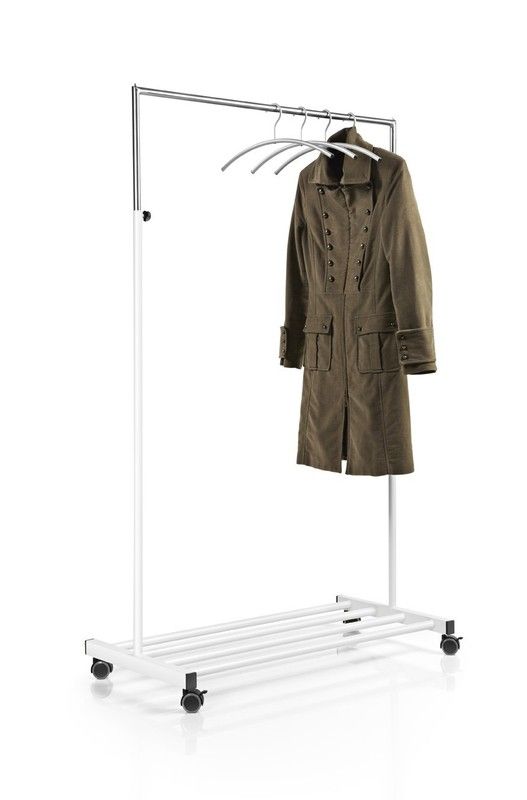 Perchero metálico ten para perchas con ruedas. Medidas: 120 x 53 x 174 cm. Estructura metálica de tubo pintado en blanco. La barra superior es graduable en altura y la base inferior puede soportar objetos. Modelo con ruedas con frenos.