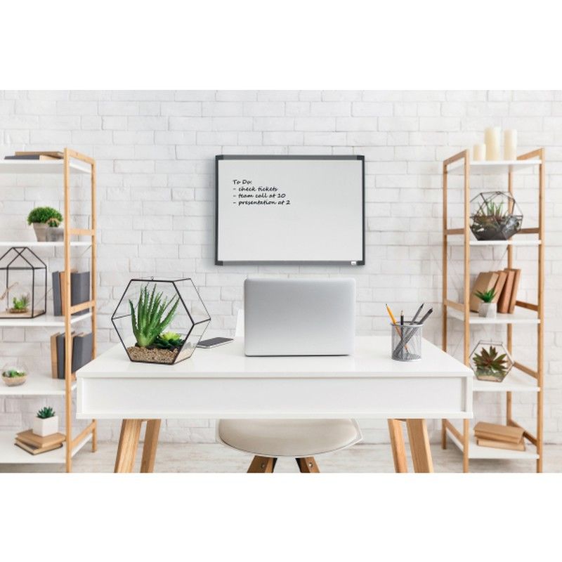 Esta pequeña pizarra es el complemento perfecto para cualquier oficina o espacio familiar con su superficie de limpieza en seco. Con un elegante marco de dos tonos, cualquiera que sea la combinación de colores que recibas de la variedad de negro, gris o blanco, puedes estar seguro de que este tablero de notas se adaptará a cualquier entorno. Se puede montar en la pared con almohadillas adhesivas que se pueden colocar en orientación vertical u horizontal. Con un clip porta rotulador para pizarra integrado para asegurar el rotulador a la pizarra. Es el tablero de notas perfecto para planificar, anotar recordatorios o ideas. Se suministra con un rotulador para pizarra, 2 imanes para pizarra y almohadillas adhesivas de montaje. Tamaño: 585x430mm.