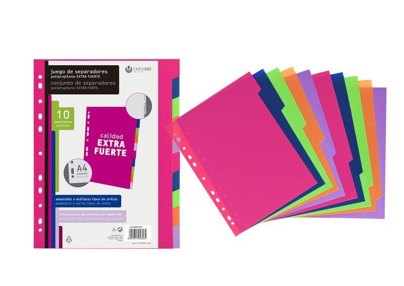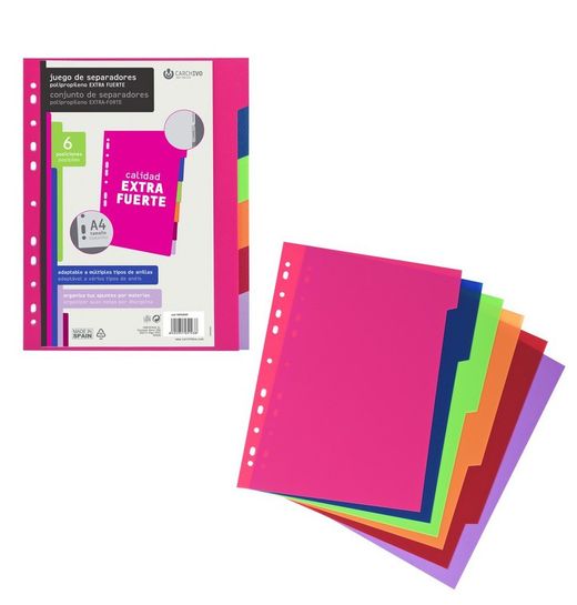 Separadores fabricados en polipropileno de alta resistencia y dureza. Tamaño din a-4 con taladro universal.. Puedes elegir entre el juego de 6 separadores o el juego de 10 separadores.