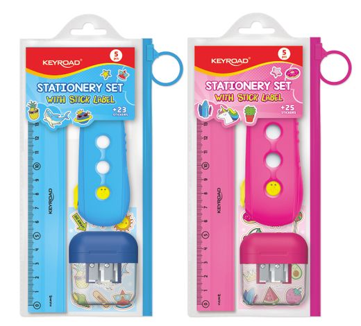Set compuesto por estuche de plástico con cremallera + regla de plástico de 15cm + goma de borrar con protector + sacapuntas metálico de 2 usos con depósito + 23 pegatinas.
