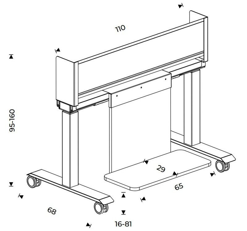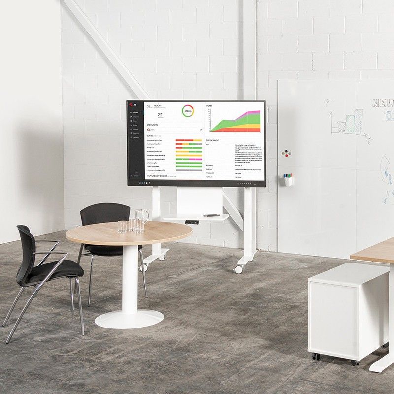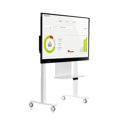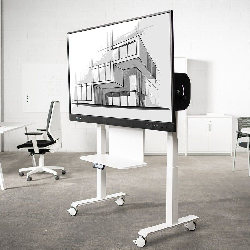 Soporte móvil compatible con los monitores interactivos de 65" a 86". Equipado con 4 ruedas robustas de alta calidad con freno de seguridad. Regulable en altura eléctricamente. Bandeja frontal. Se sirve montado